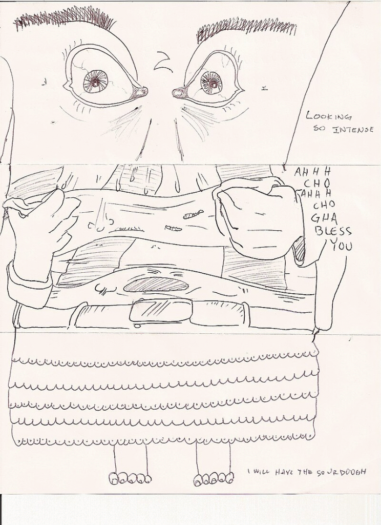 A técnica do cadáver esquisito (cadavre exquis) é especialmente interessante para experimentação pessoal ou coletiva. Originalmente, os surrealistas jogavam assim: uma pessoa escrevia uma frase ou desenhava algo em um papel, dobrava para esconder o que havia feito, e passava para a próxima pessoa, que continuava sem ver o anterior. O nome vem da primeira frase criada por esse método: “O cadáver esquisito beberá o vinho novo.”