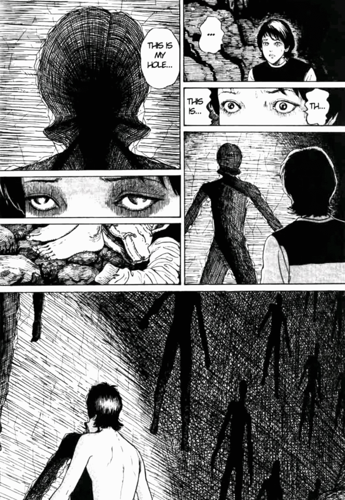 Considere as vítimas de Uzumaki que gradualmente têm seus corpos retorcidos em espirais vivas, ou os jovens de “O Enigma da Falha de Amigara” que são irresistivelmente atraídos para buracos perfeitamente moldados em suas formas. Ou seja, o horror não está apenas na transformação física, mas no inevitável: personagens sabem o que está acontecendo, compreendem a futilidade de resistir, mas são impotentes para impedir. Esta é a angústia existencial visualizada que diz que somos observadores aprisionados em corpos que podem se tornar nossas prisões mais grotescas.