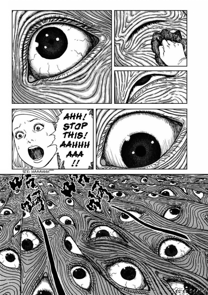 O que separa o body horror de Ito de outros é essa ênfase na consciência, principalmente durante a transformação. Suas vítimas raramente perdem a razão completamente, elas permanecem lucidamente conscientes enquanto seus corpos traem toda noção de normalidade. Isso acaba criando uma crueldade narrativa: o leitor não pode se distanciar dizendo “eles enlouqueceram”. Não, eles estão conscientes, e nós estamos conscientes com eles, forçados a imaginar como seria experimentar nossos próprios corpos tornando-se alienígenas para nós. É por isso que o horror corporal de Junji Ito é tão intenso: ele te obriga a participar mentalmente da metamorfose.