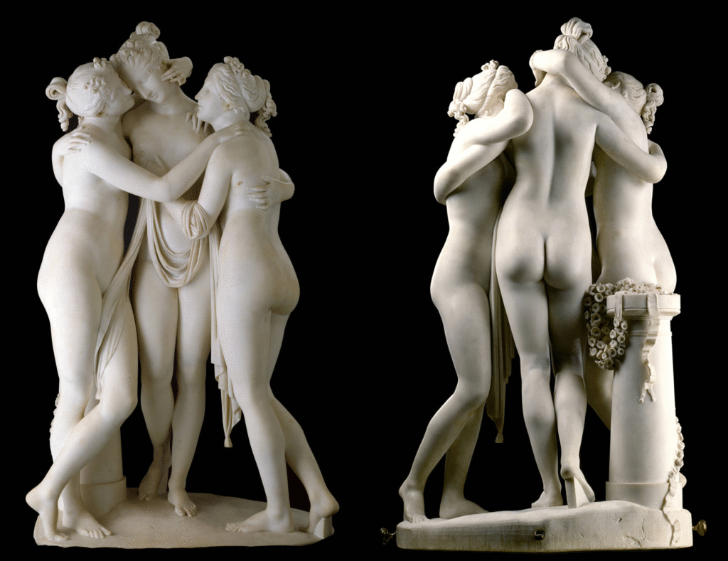 Canova posicionou as três figuras em um abraço triangular, com os braços delicadamente entrelaçados e as cabeças inclinadas em direções variadas, criando uma composição de elegância, equilíbrio e refinamento incomparáveis. Cada detalhe, desde os dedos delicadamente curvados até as mechas de cabelo finamente esculpidas, demonstra a atenção obsessiva do artista à perfeição.